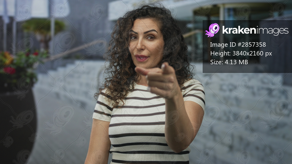 Young hispanic woman wearing striped shirt pointing finger to camera on sunlit street; confidence empowerment resilience growth.