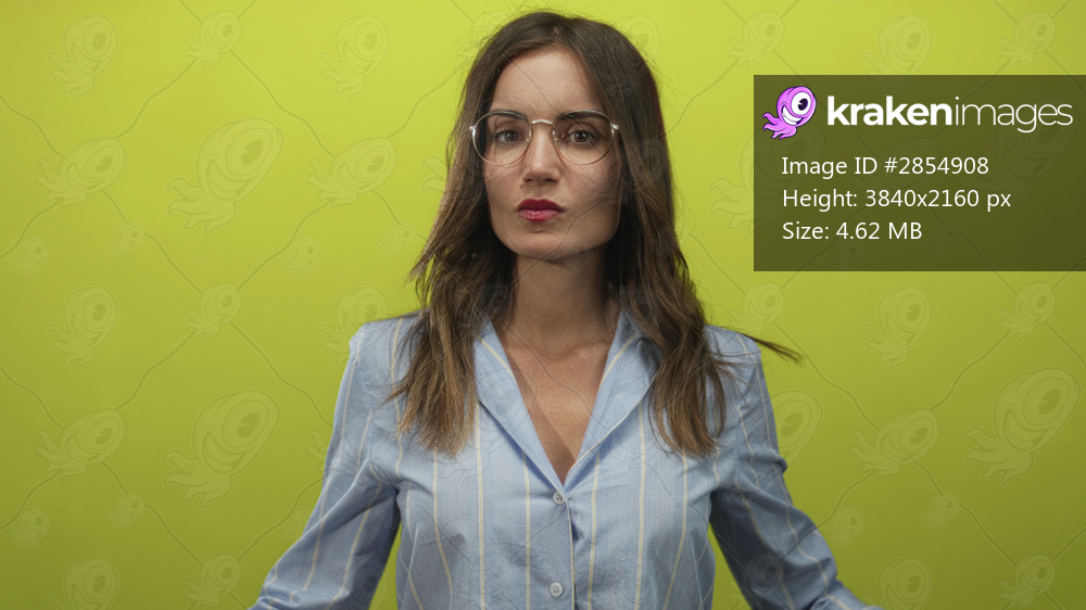 Young hispanic woman wearing striped shirt and round glasses with crossed arms in green studio; rejection.
