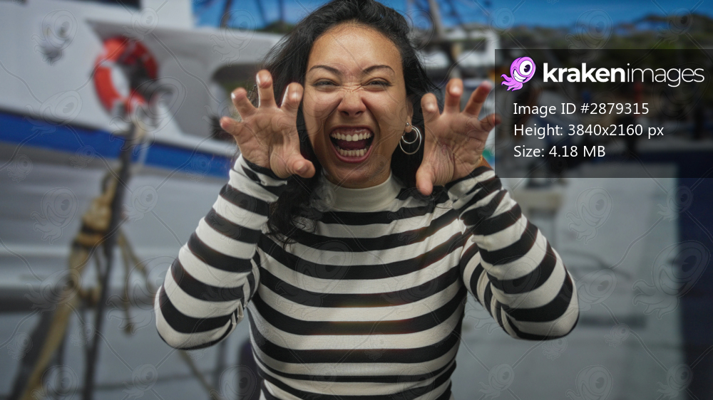 Young hispanic woman wearing striped turtleneck making claw gesture with hands near face in studio; playful mischief joy.