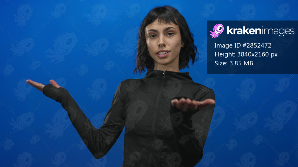 Young hispanic woman wearing tight black sports jacket holds palms up in studio demonstration; confidence.