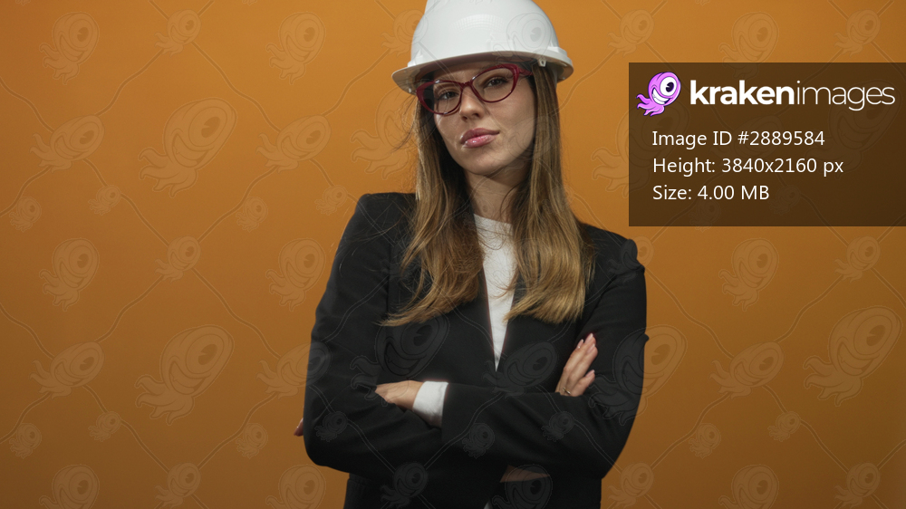 Young hispanic woman wearing white hardhat and red glasses, arms crossed in black blazer looking at camera in studio with orange backdrop; confidence leadership. - Kraken Images