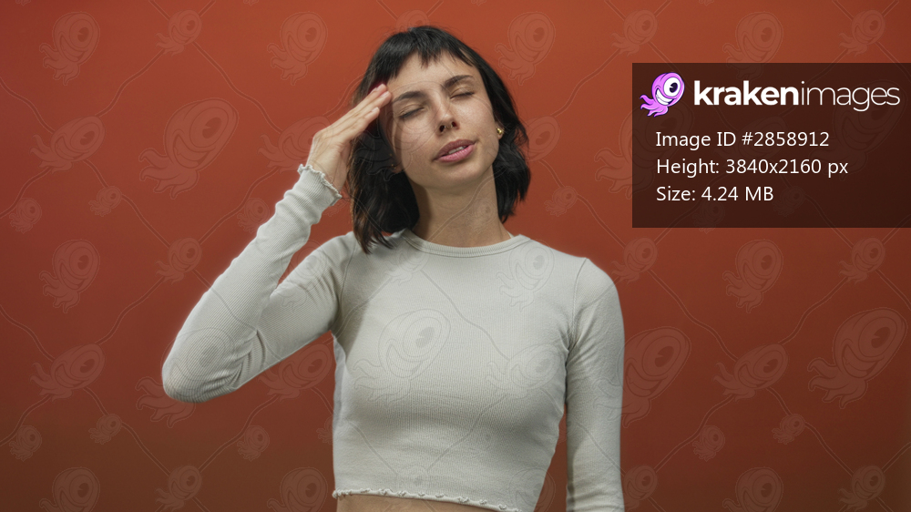 Young hispanic woman wearing white ribbed long sleeve top yawns with hand covering mouth in orange studio scene; tiredness