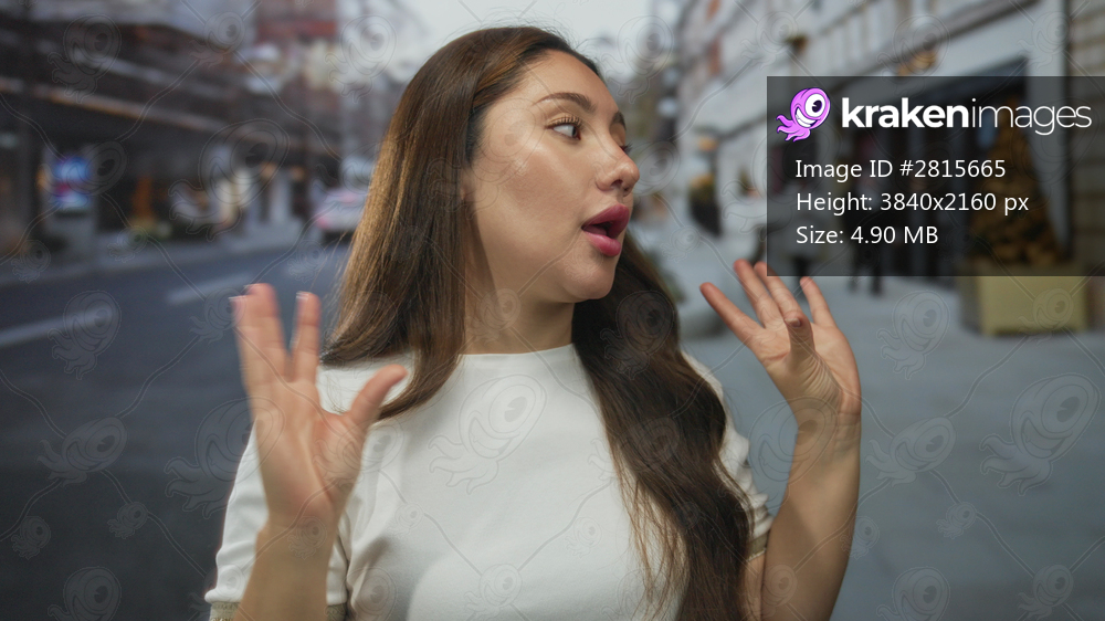 Young hispanic woman wearing white shirt gesturing with hands on bustling city street; animated conversation.
