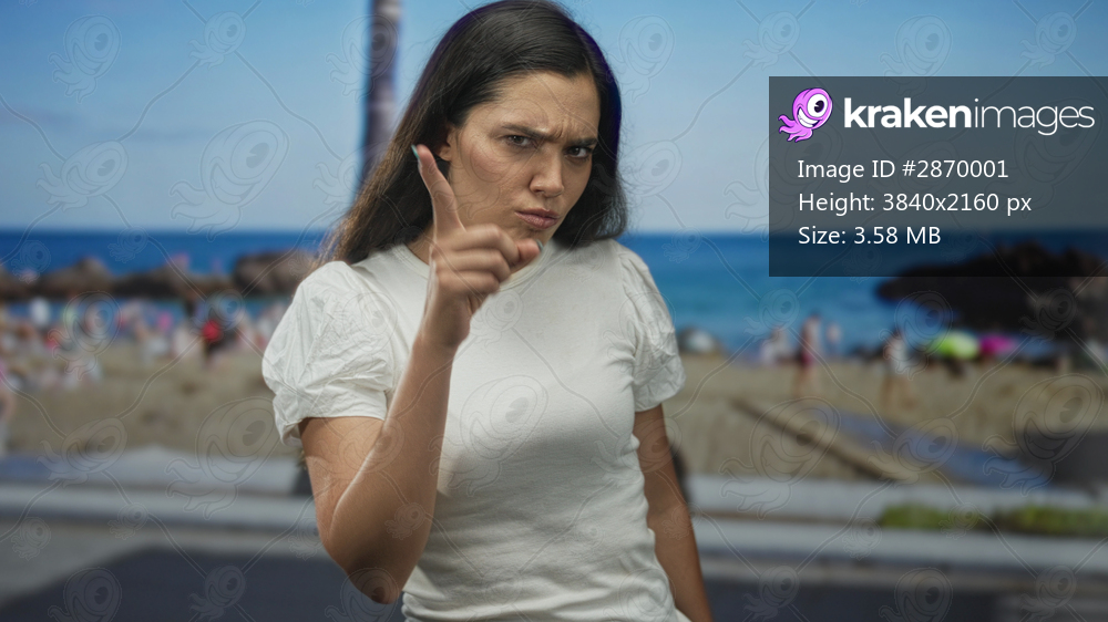 Young hispanic woman wearing white shirt pointing finger at camera on street under clear blue sky; anger.