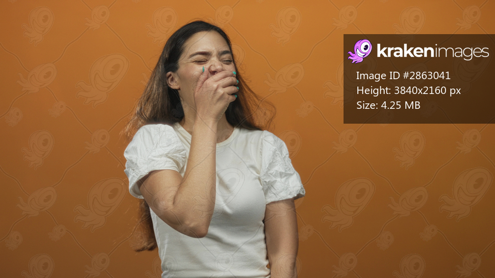 Young hispanic woman wearing white shirt stifles laughter and covers mouth in bright orange studio; amusement joy.