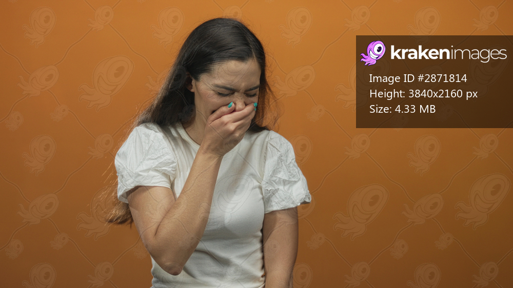 Young hispanic woman wearing white shirt stifles laughter and covers mouth in bright orange studio; amusement joy.