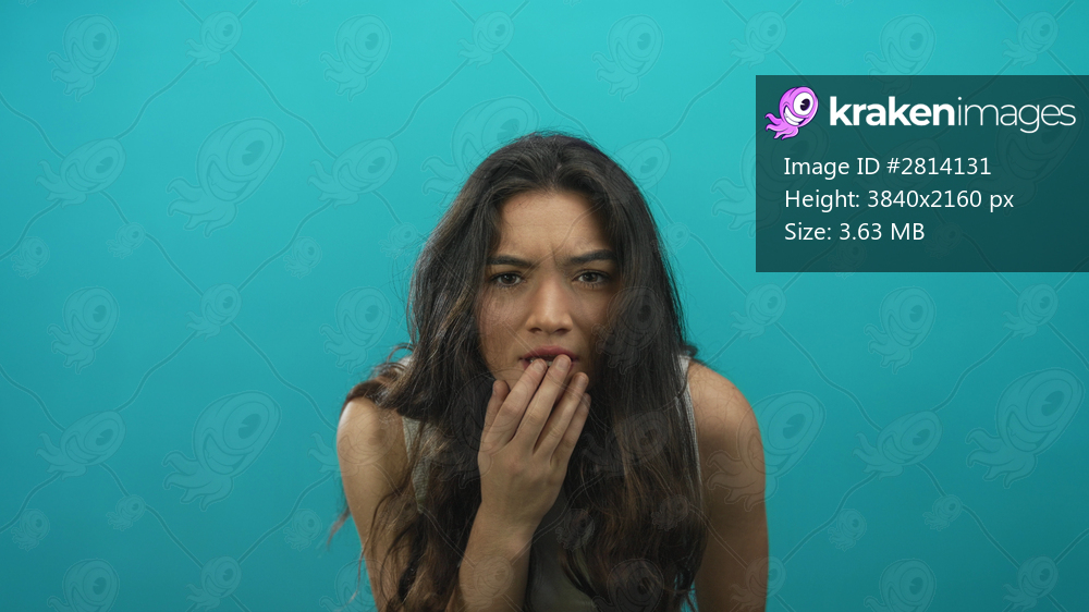 Young hispanic woman wearing white tank top clenches fist and squints toward camera in teal studio; determination focus.