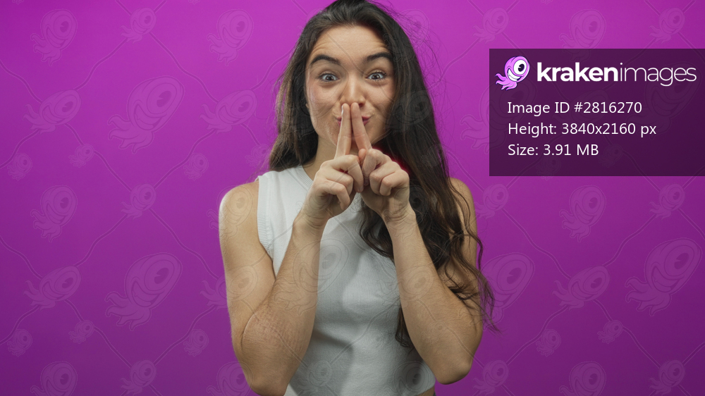 Young hispanic woman wearing white top finger to lips for silence in magenta studio; silence secret hush.