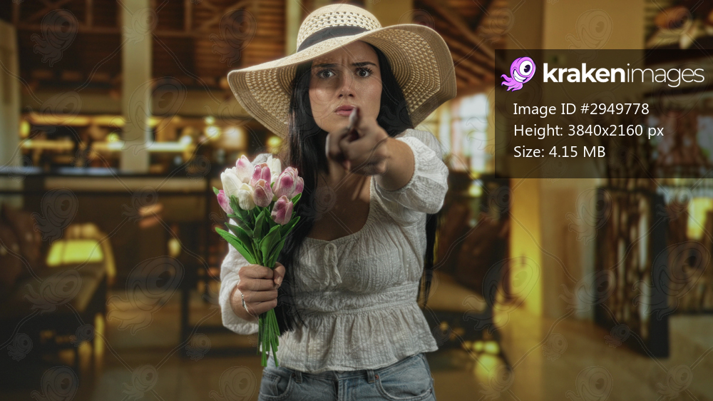 Young hispanic woman wearing wide brim hat, white blouse and jeans, holding pink tulips and beckoning with outstretched hand in building lobby; anger.