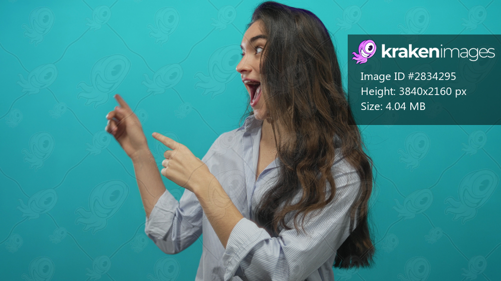 Young hispanic woman with wide eyes and open mouth pointing finger in turquoise studio space; surprise.