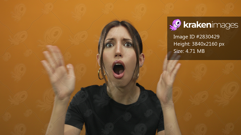 Young hispanic woman with wide eyes showing open mouth and raised palms and hoop earrings in orange studio; surprise.