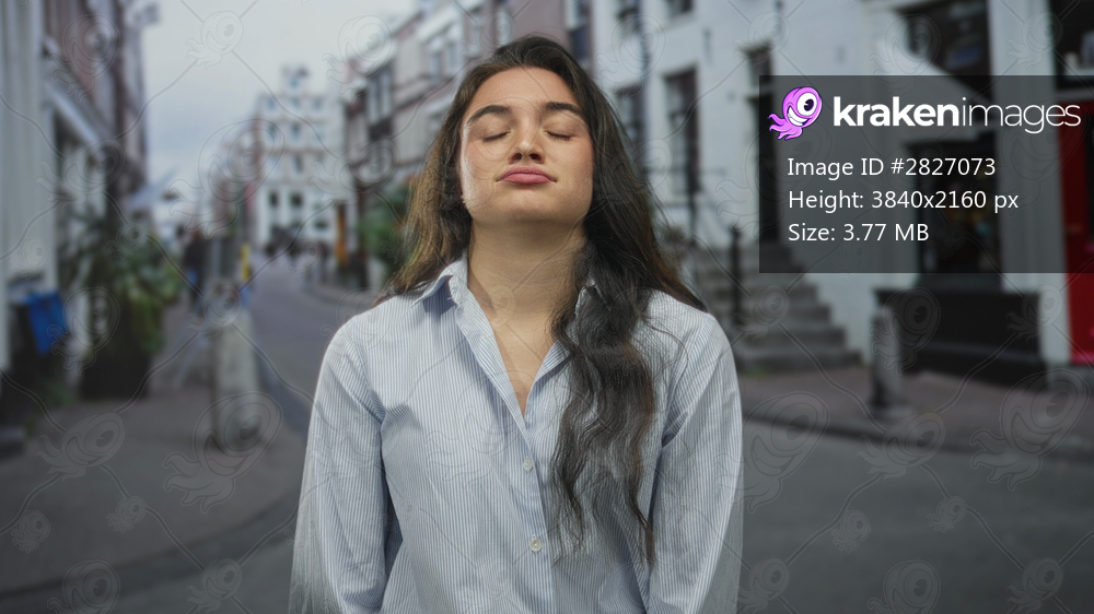 Young hispanic woman winking with one eye on a bustling city street in front of storefronts; indifference.
