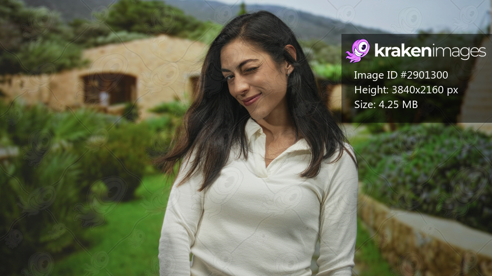 Young hispanic woman winking and smiling in a sunlit green park by a stone building and garden path; playful confidence.