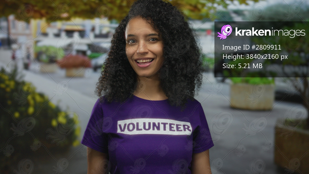 Young hispanic woman winks eye wearing purple volunteer shirt on street with concrete planters and foliage; playfulness.