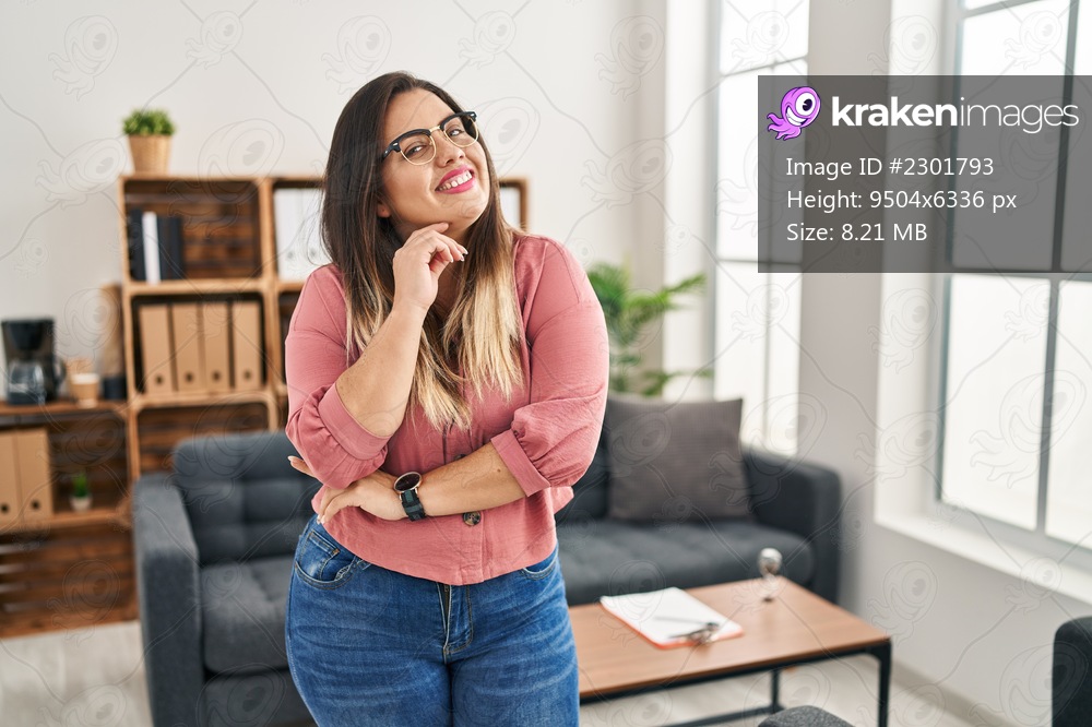 Young hispanic woman working at the office wearing glasses smiling looking confident at the camera with crossed arms and hand on chin. thinking positive. - Kraken Images