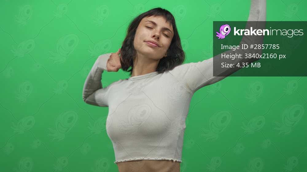 Young hispanic woman yawns with hand covering mouth while stretching arms overhead in green studio wearing crop top; fatigue.