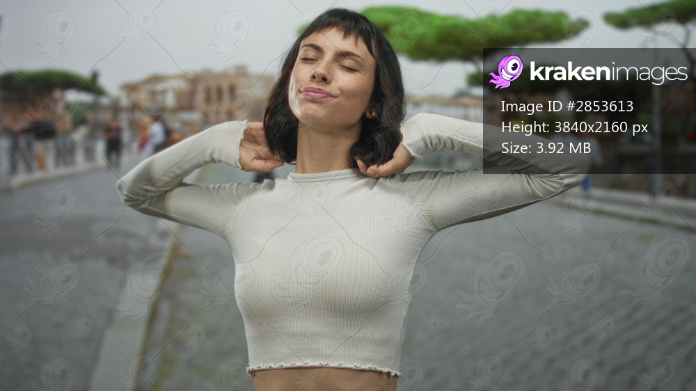 Young hispanic woman yawns with open mouth and stretches arms on busy street in morning sunlight; sleepiness fatigue.