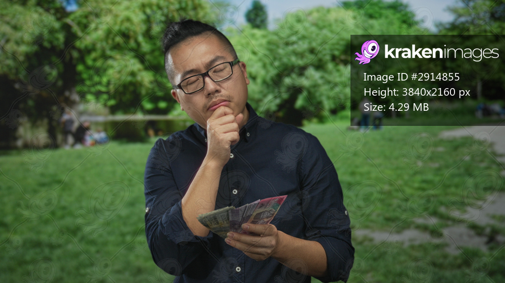 Young indonesian man with glasses and bun counting rupiah banknotes in park by pond; financial concern.