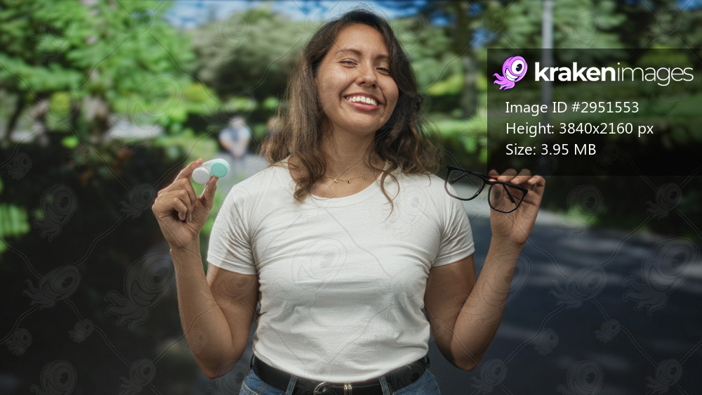 Young latin hispanic smiling woman holding glasses and contact case on street with green trees and park path; happiness eye care.