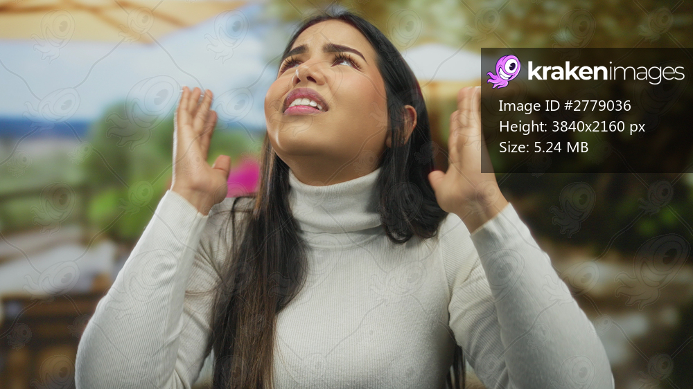 Young latin hispanic woman covering ears on an outdoor restaurant terrace looks frustrated.