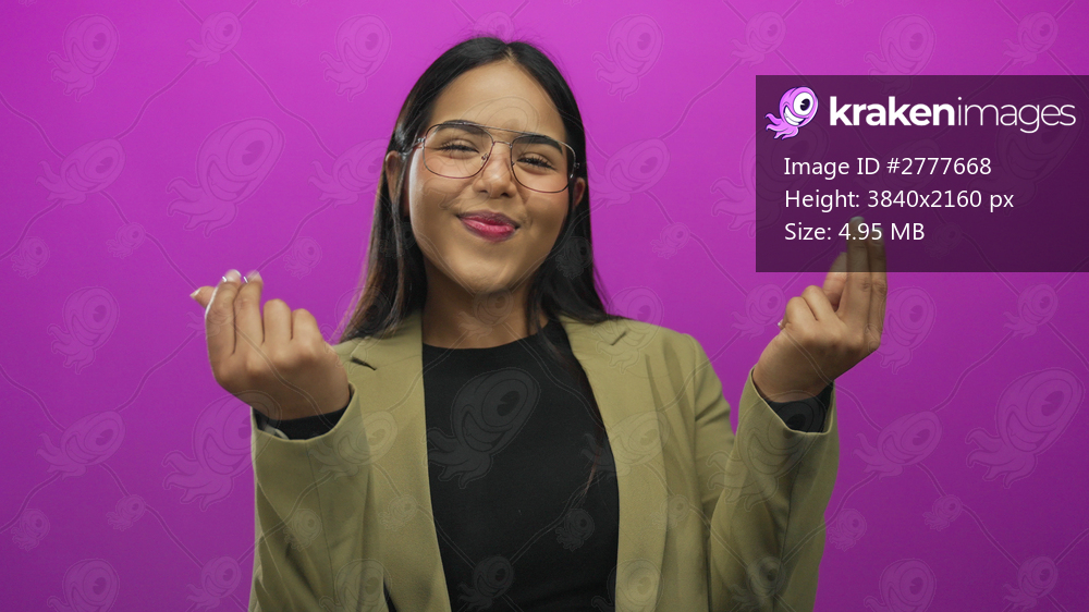 Young latin hispanic woman holds hands in money gesture against isolated pink background.