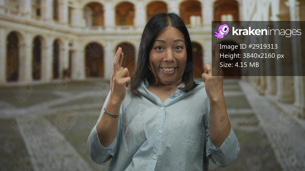 Young latin hispanic woman smiling with hands clasped in prayer and palms pressed to chest in historic building courtyard, eyes closed; gratitude calm. - Kraken Images