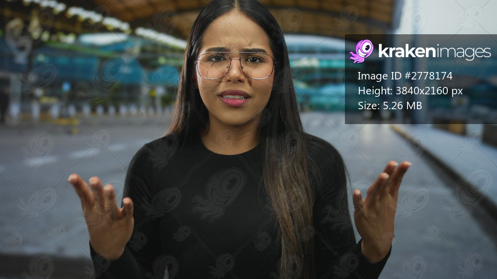 Young latin woman at airport terminal outdoors looking pensive and frustrated, wearing glasses and black clothing, showcasing travel emotions and anticipation. - Kraken Images