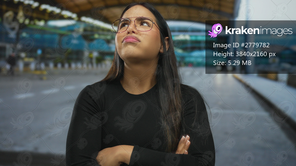 Young latin woman at airport terminal outdoors looking pensive and frustrated, wearing glasses and black clothing, showcasing travel emotions and anticipation. - Kraken Images