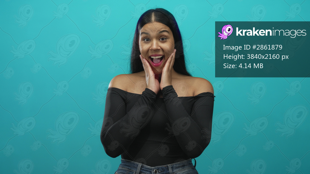 Young latin woman with bare shoulders and hands on cheeks in studio with turquoise background; surprise.