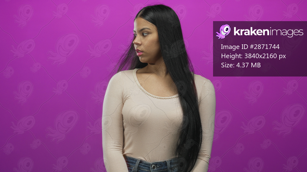 Young latin woman clutches chest and gazes sideways in studio setting with purple backdrop; anxiety.