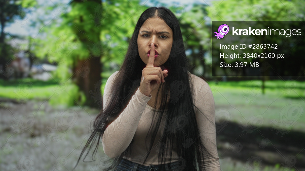 Young latin woman finger to lips for silence in forest under bright midday light and green canopy; hush.