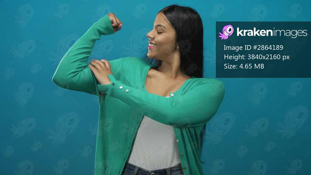 Young latin woman flexes left bicep and points finger to muscle while wearing green cardigan and white tank top in blue studio; confidence.