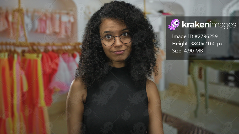Young latin woman gesturing finger to lips amid colorful racks in a clothing shop interior; secret silence.