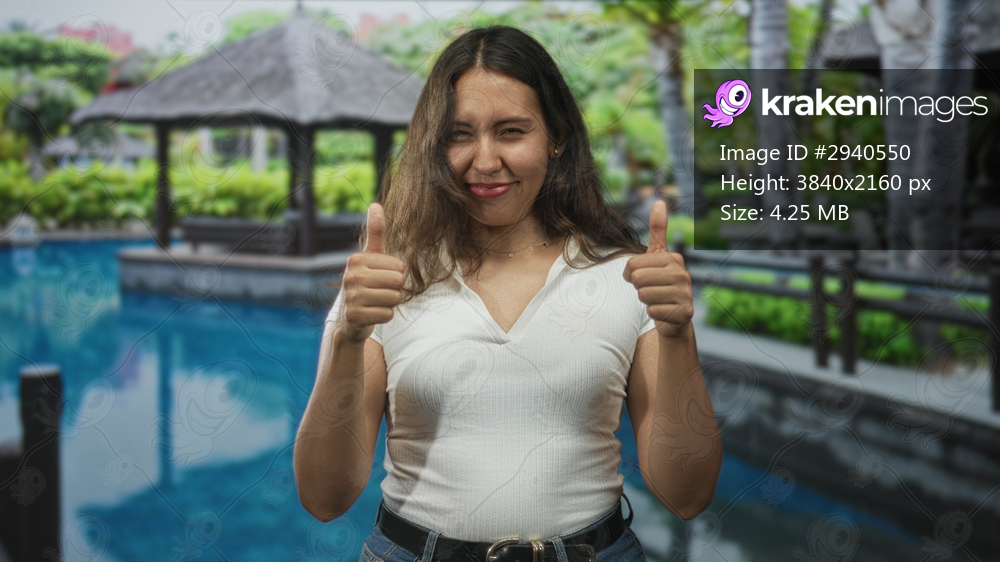 Young latin woman gives double thumbs up at outdoor pool with hands visible and smiling face; approval encouragement joy.