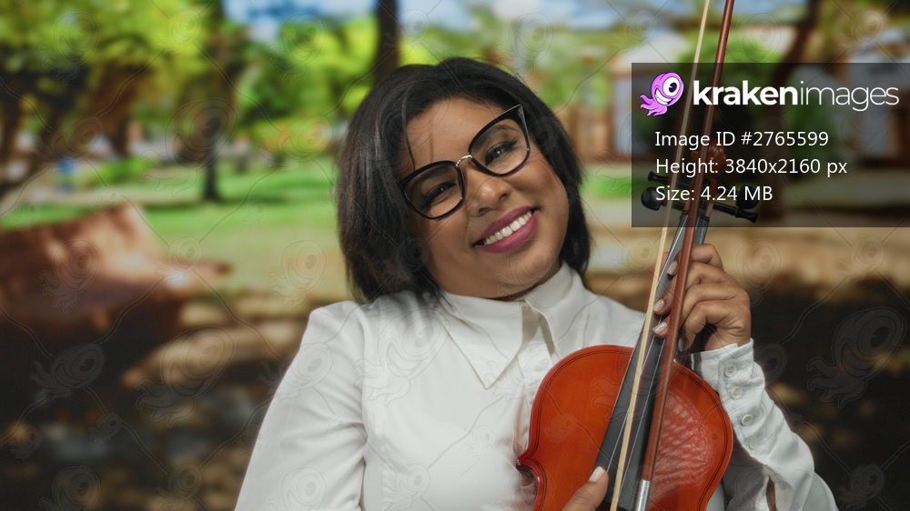 Young latin woman with glasses holding a violin and smiling in a park setting, showcasing musical joy and confidence in an outdoor environment.