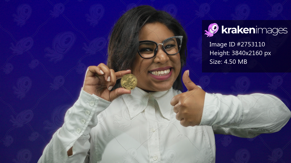 Young latin woman with glasses holding litecoin coin enthusiastically against a vibrant blue background expressing positivity and interest in cryptocurrency. - Kraken Images