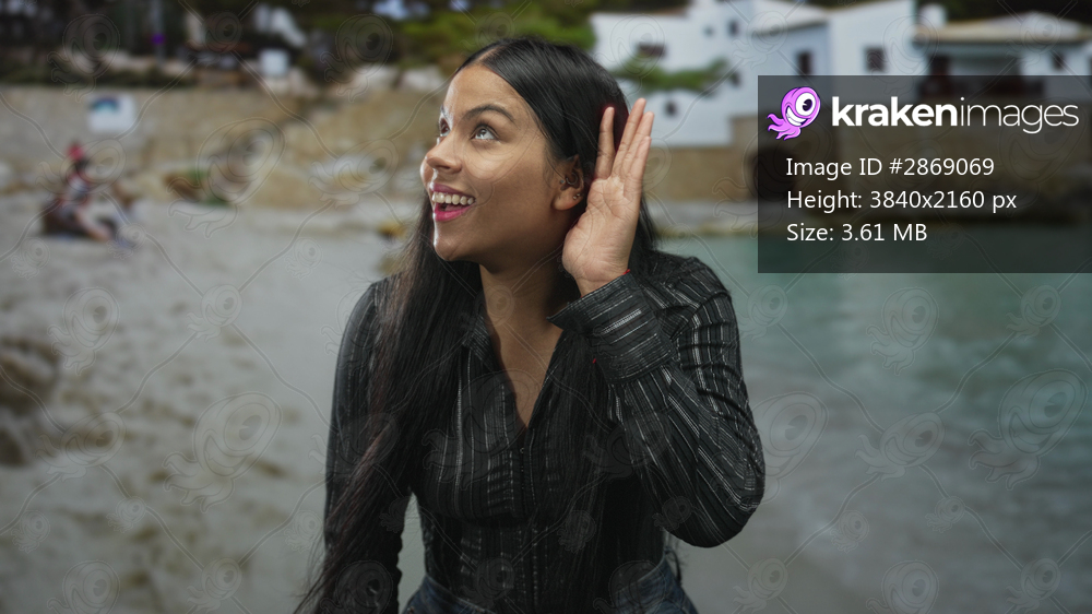 Young latin woman hand to ear listening at sandy beach coastline beside calm sea near beach houses; curiosity.