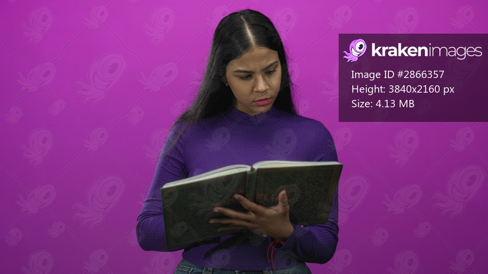 Young latin woman holding and reading a large ornate book against a vibrant purple backdrop in studio; curiosity.