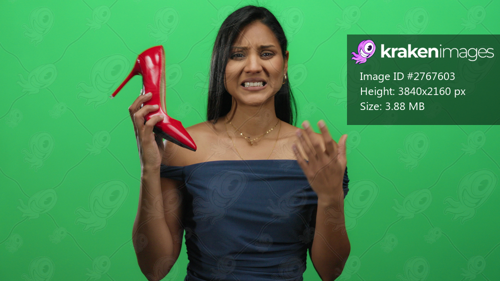 Young latin woman holding red shoe yelling excitedly against isolated green background wall in studio setting