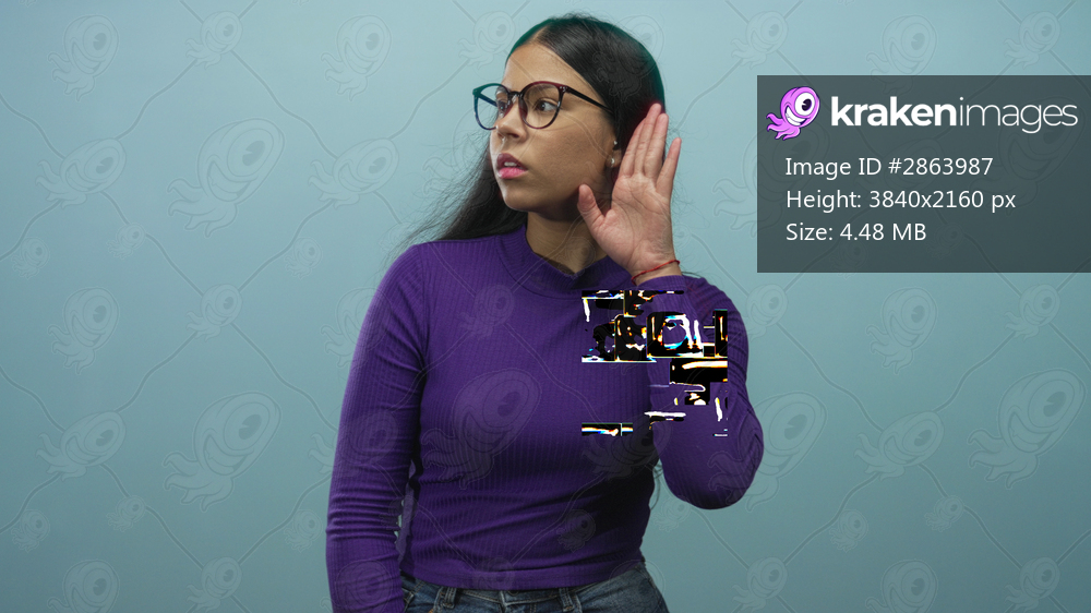 Young latin woman holds hand to ear listening in blue studio; curiosity discovery awareness exploration.