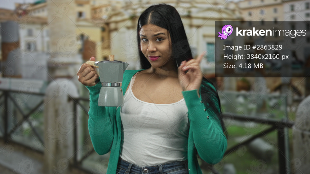 Young latin woman holds moka pot and points finger among ancient roman ruins outdoors; uncertainty.