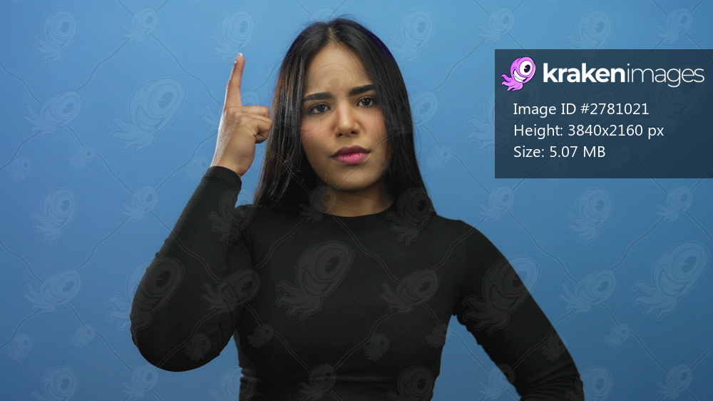 Young latin woman in black shirt with confident expressions, pointing against a blue wall background, isolated emotionally while engaging the viewer.