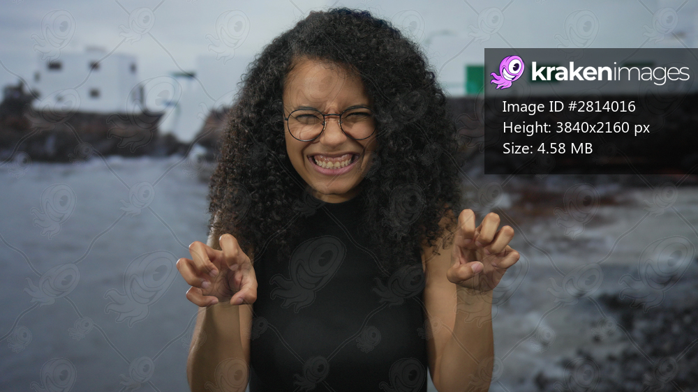 Young latin woman in glasses makes claw gesture on a rocky seaside beach on a sunlit morning; playful joy.