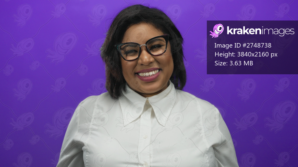 Young latin woman in glasses smiling warmly, gesturing playfully against a vibrant purple background, wearing a stylish white shirt, exuding positivity and confidence. - Kraken Images
