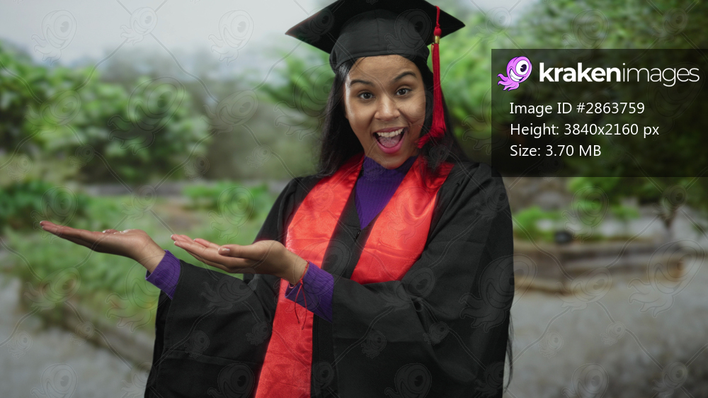 Young latin woman in graduation gown and mortarboard extends open palms amid lush forest greenery; pride.
