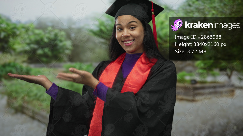 Young latin woman in graduation gown and mortarboard extends open palms amid lush forest greenery; pride.