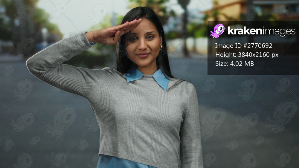 Young latin woman in grey sweater with blue collar makes a military salute on a sunny day in an urban outdoor setting, expressing confidence and discipline. - Kraken Images
