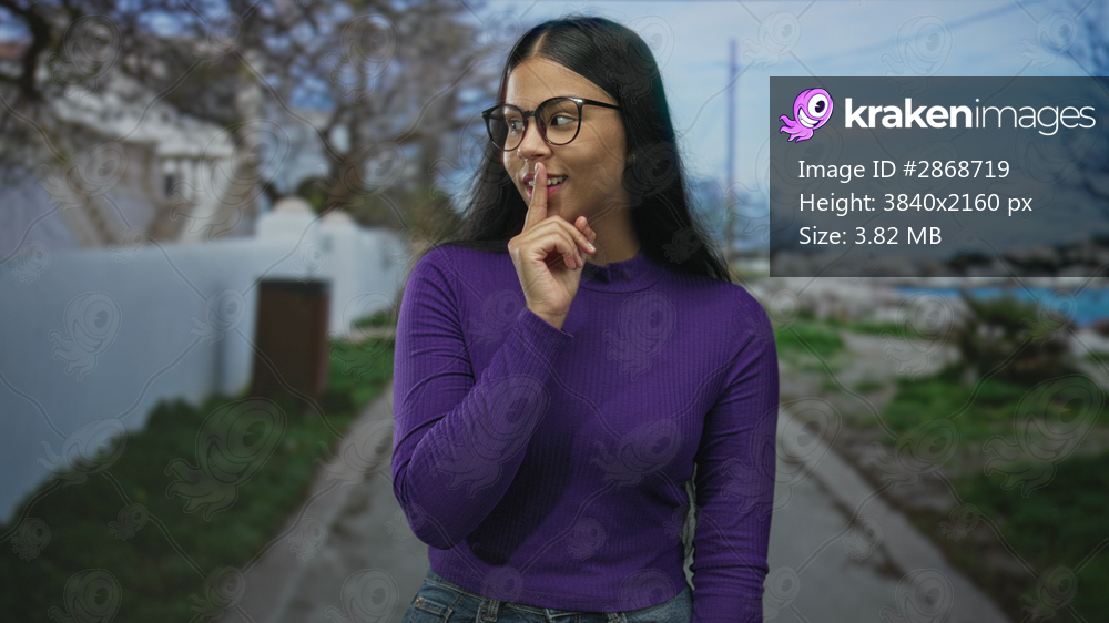 Young latin woman in purple sweater and glasses pressing finger to lips for silence on street; quiet secrecy.