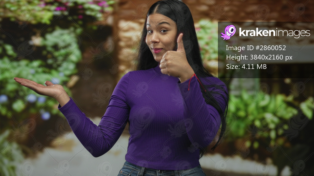 Young latin woman in purple top finger pointing to her open palm in old town street lined with stone buildings; open invitation.