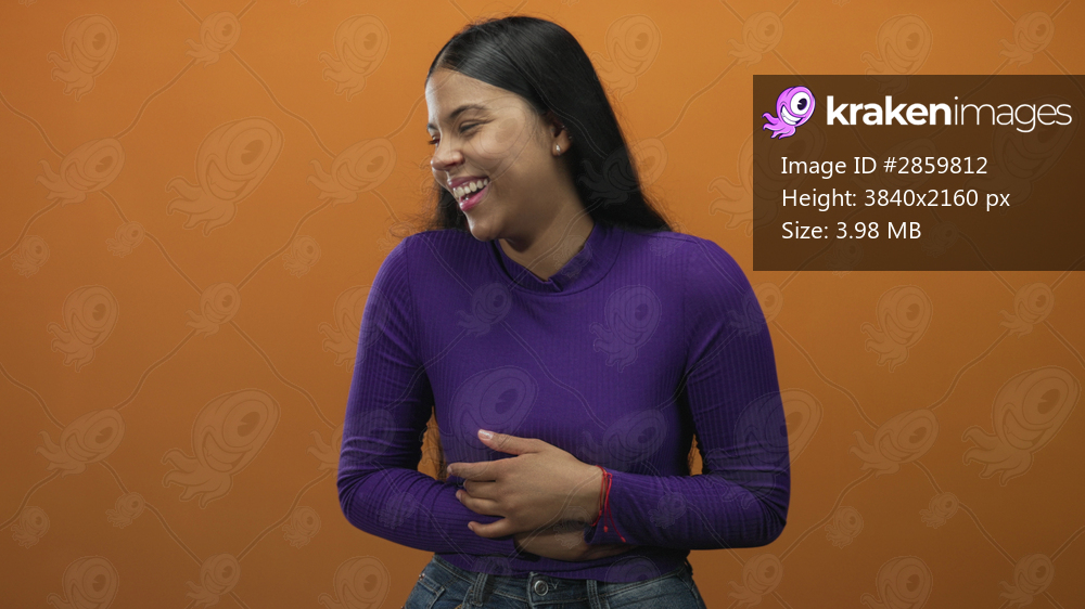 Young latin woman laughing with mouth open against orange studio wall; joy wellness healing.